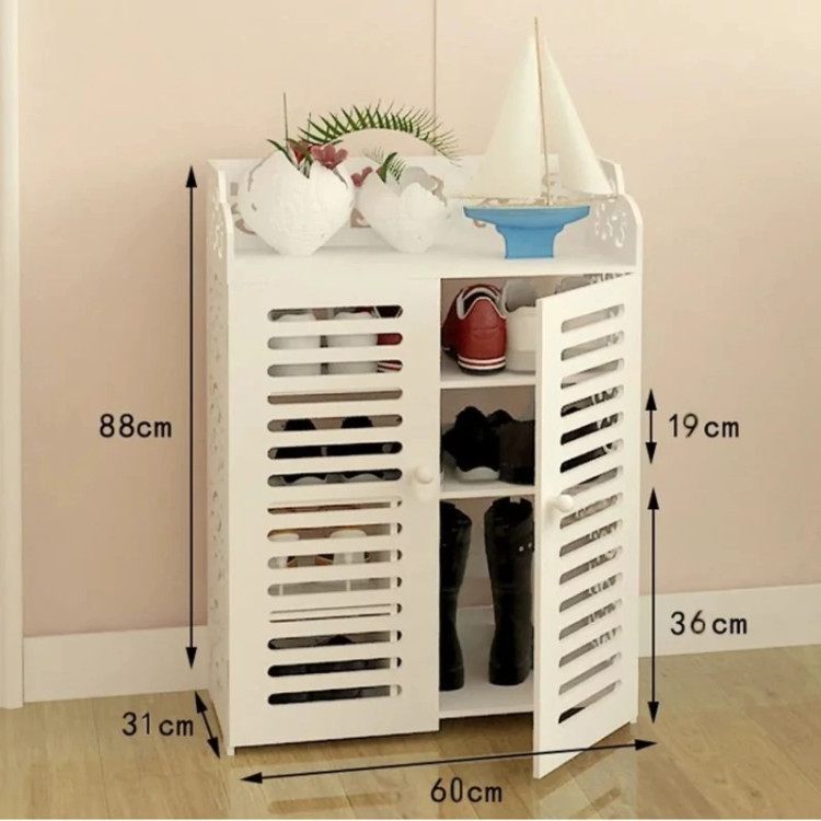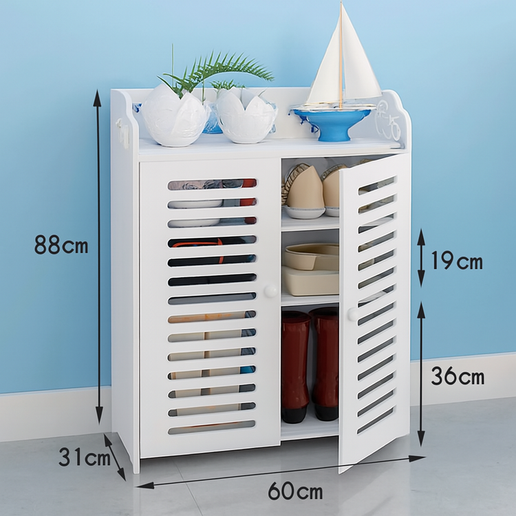 با سه طبقه داخلی، این جاکفشی فضای کافی برای نگهداری کفشهای روزمره، پاشنهدار و حتی بوتهای بلند را فراهم میکند. دربها بهراحتی باز و بسته میشوند و دسترسی به کفشها سریع و آسان است. همچنین سطح بالای کابینت فضای مناسبی برای قرار دادن گلدان، قاب عکس یا وسایل تزئینی فراهم میکند.