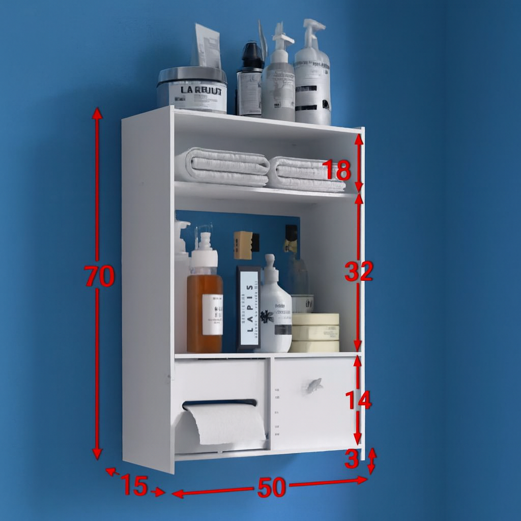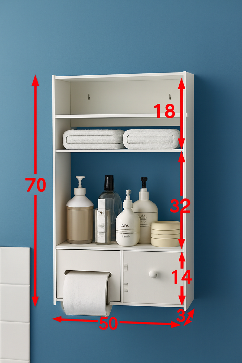 تقسیمبندی هوشمندانه این شلف، امکان استفاده همزمان از فضای باز و بسته را فراهم کرده است. طبقههای باز برای حوله، شامپو یا وسایل تزئینی مناسباند، در حالی که محفظههای پایینی برای نگهداری وسایل شخصی یا رول دستمال توالت طراحی شدهاند. درب بیضی شفاف دسترسی سریع را ممکن میسازد و درب ساده با دستگیره گرد، ظاهری مرتب و یکدست به محصول میدهد.