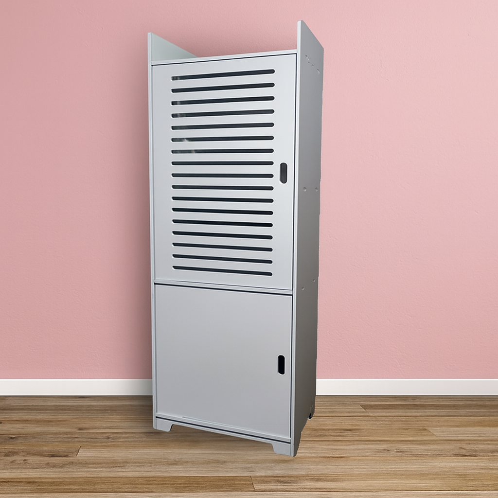 - طراحی درب بالایی مشبک برای تهویه بهتر، درب پایینی ساده برای نگهداری وسایل خصوصی