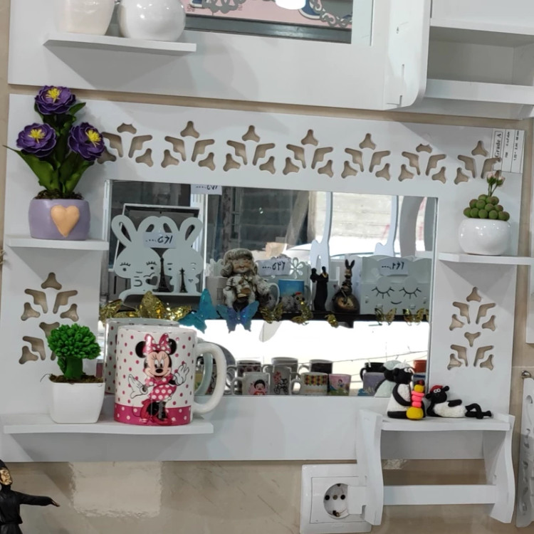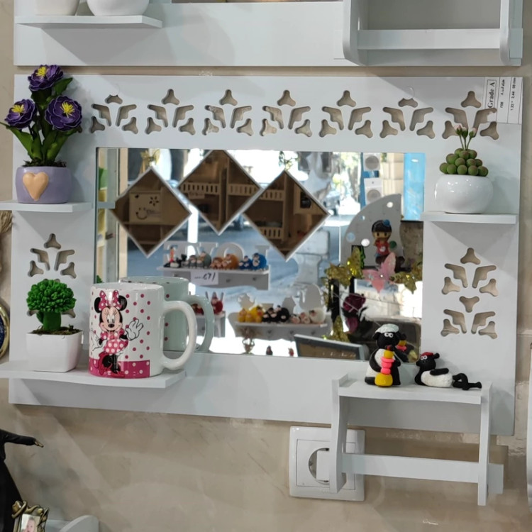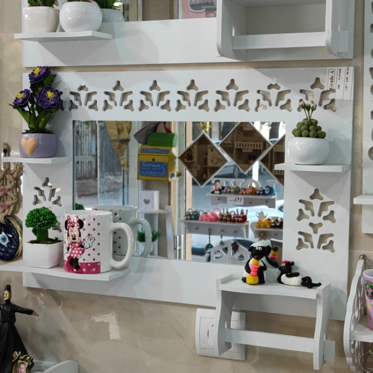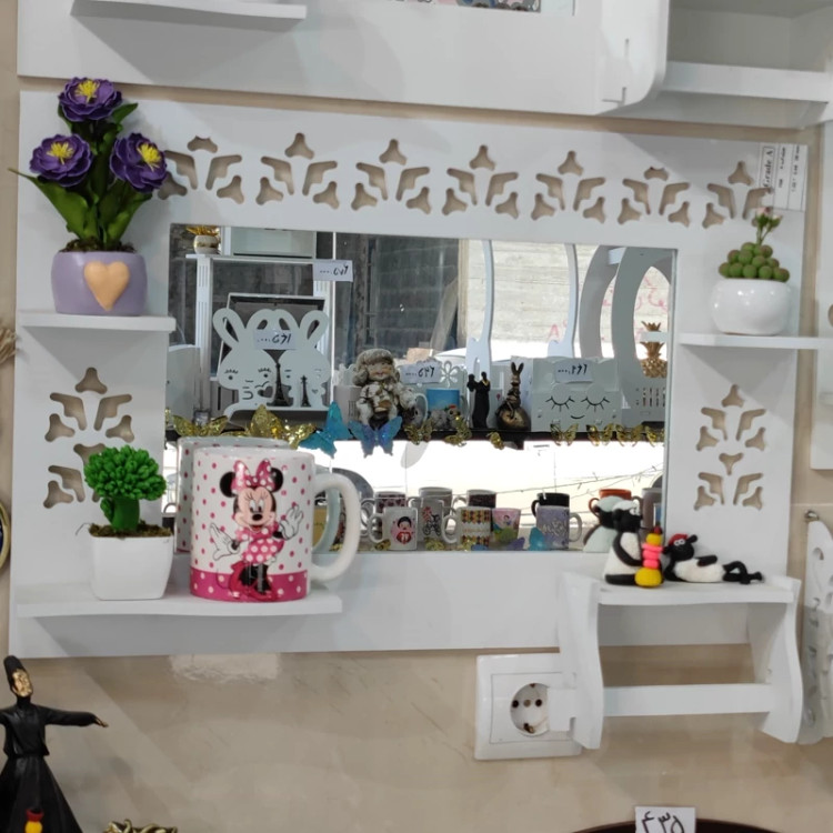 محصول آینه سرویس مدل افقی یک طرح پر کاربرد دارای جای دستمال رولی و سه عدد طاقچه مناسب گذاشتن صابون شامپو گل و مجسمه نصب راحت و آسان