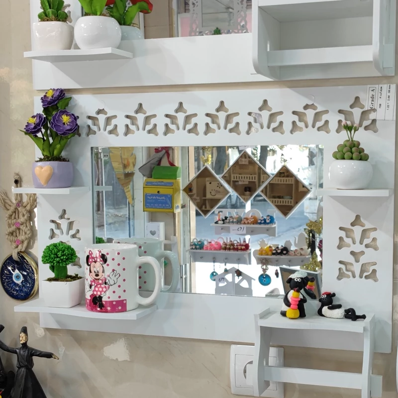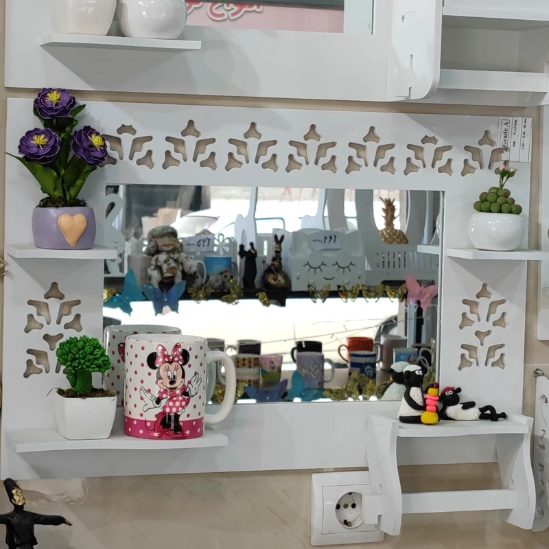 محصول آینه سرویس مدل افقی یک طرح پر کاربرد دارای جای دستمال رولی و سه عدد طاقچه مناسب گذاشتن صابون شامپو گل و مجسمه نصب راحت و آسان